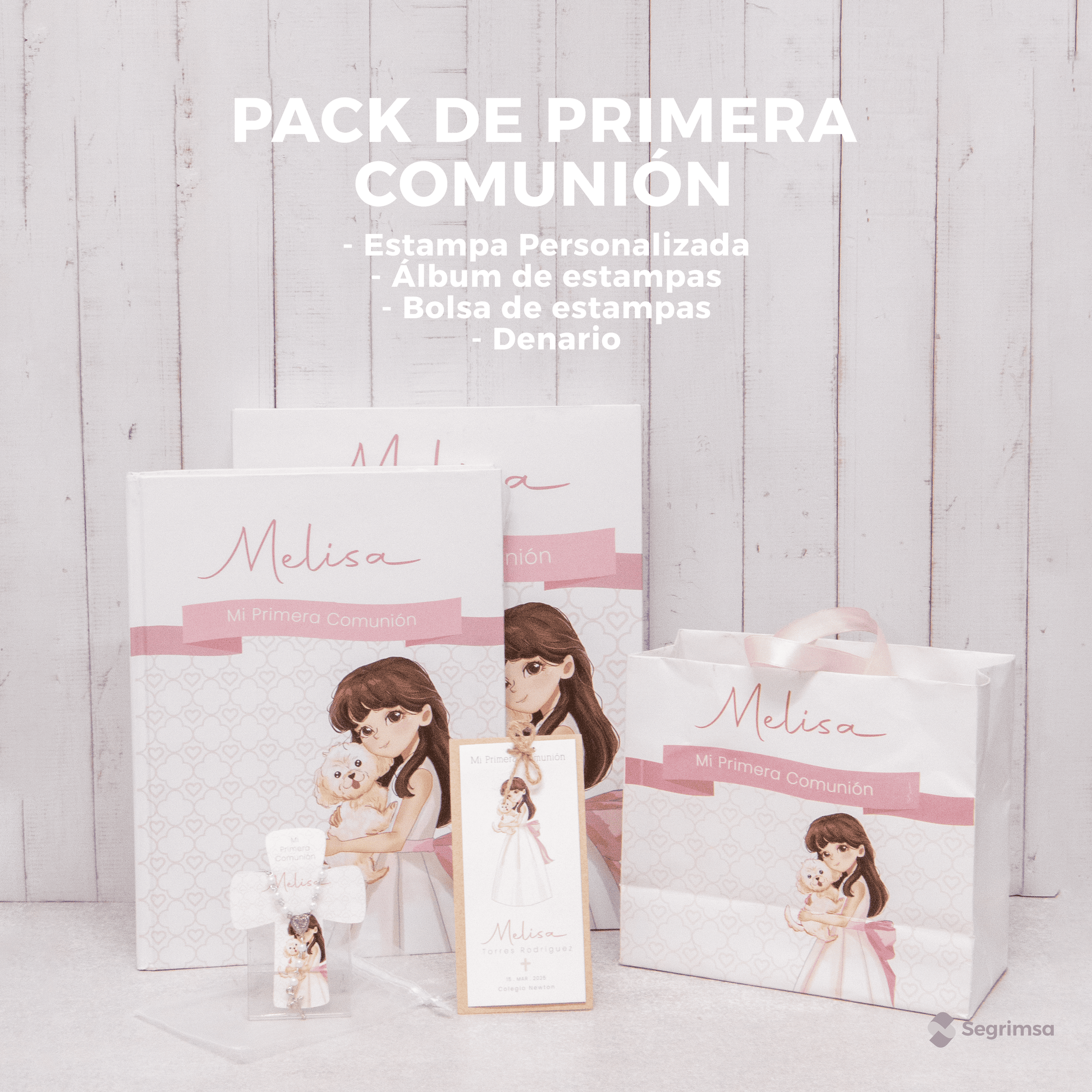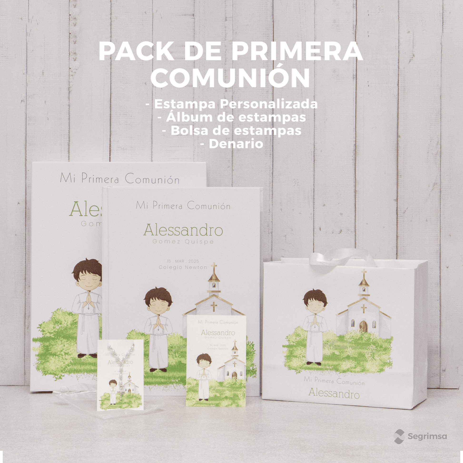 ¿Qué incluye? Estampitas de Primera Comunión + una bolsa personalizada + album de estampitas + denarios personalizadas, conoce a detalle cada uno de ellos: